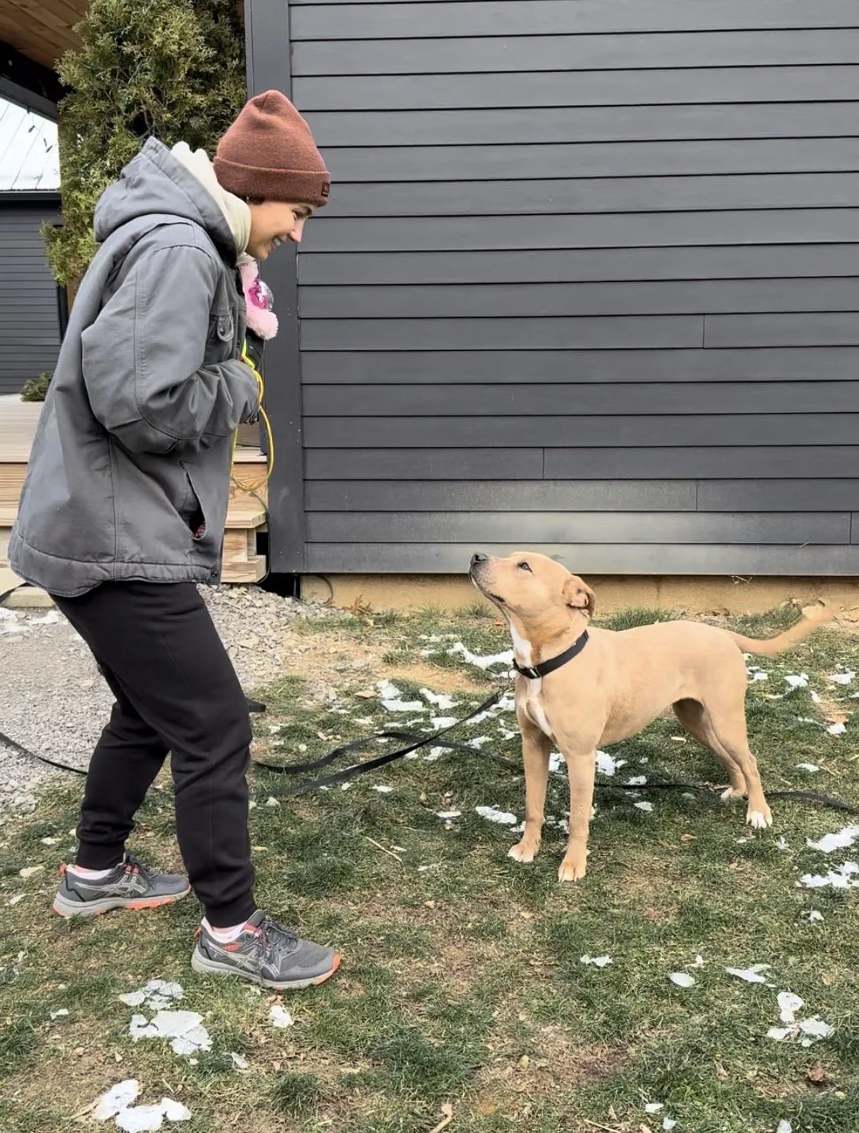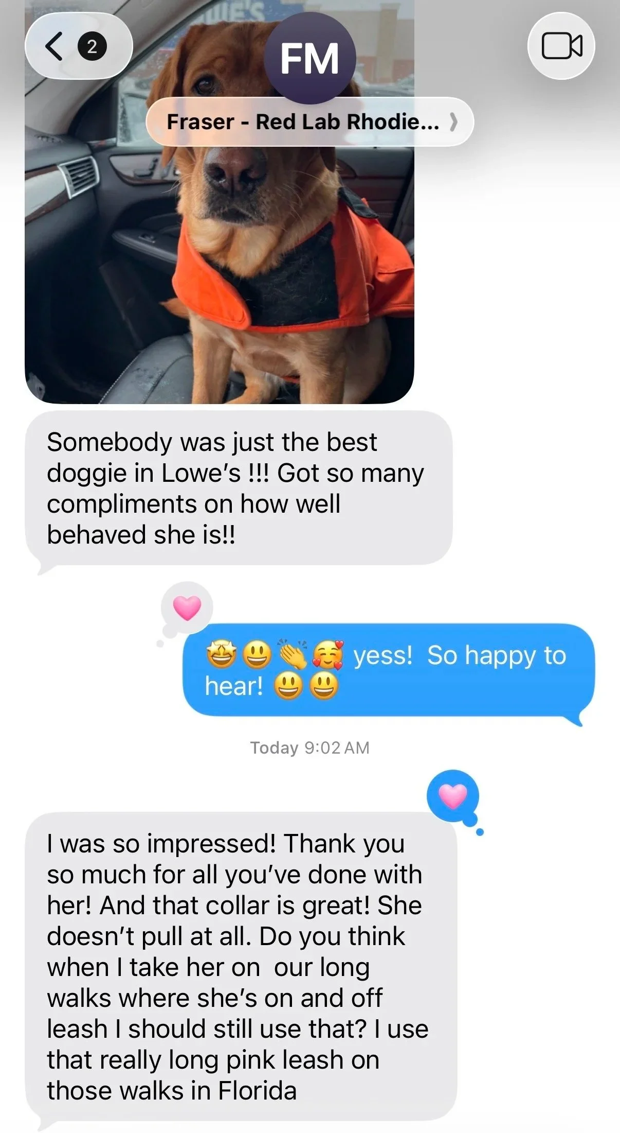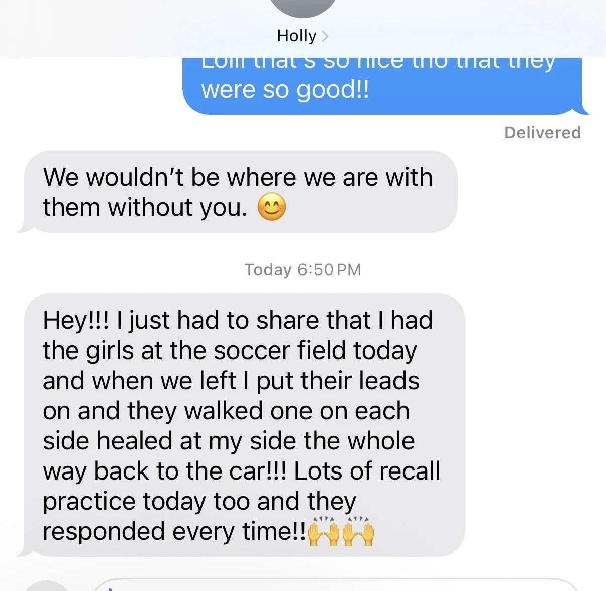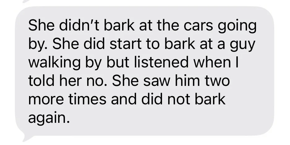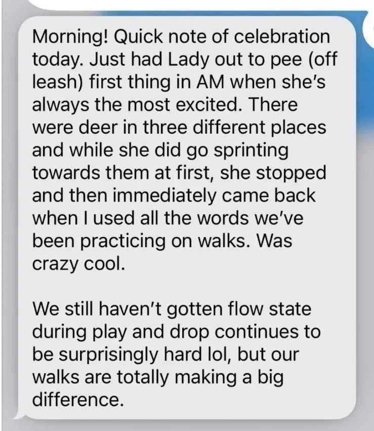 Macy contacted me shortly after adopting her dog Lady from a rescue. Things were going well but she knew they could be better. After our first call it was clear she wanted to build a rock solid relationship, where Lady would look to her for leadership and guidance no matter the situation. Three sessions in so far, focusing largely on play, flexi (retractable) leash walking, and recall and this duo is crushing it. Shared around the picture are excerpts from texts and a transcribed voice memo giving me updates on their progress. Go team!!